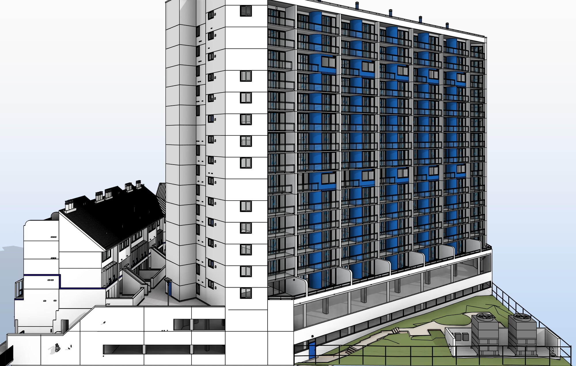 We developed a 3D BIM Model of a two-building residential block in Philadelphia, focusing mostly on the exterior.