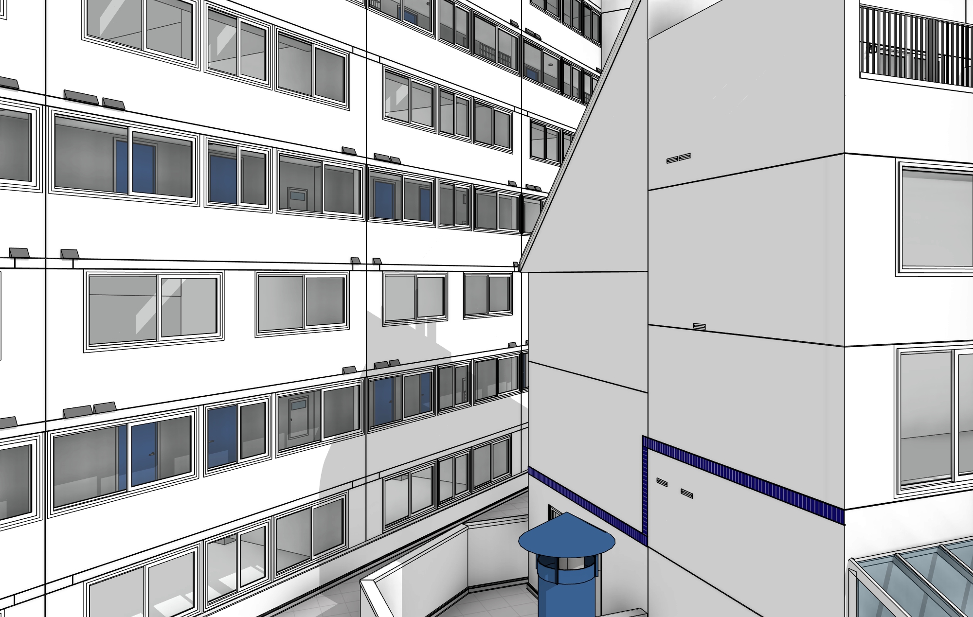 The main objective of this project is to model the facade of a multi-storey building accurately. The façade model was required because all construction drawings, vendor documentation, and renovation partners relied on this information for their work. The model served as the primary visual and technical reference for the renovation process, ensuring coordination between architects, contractors, and other stakeholders.