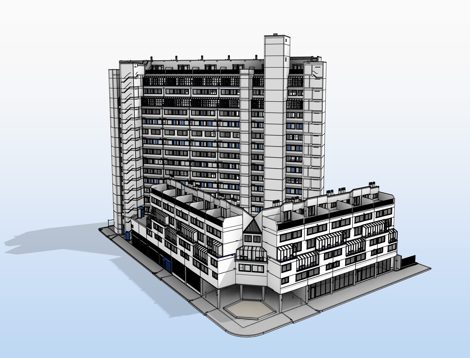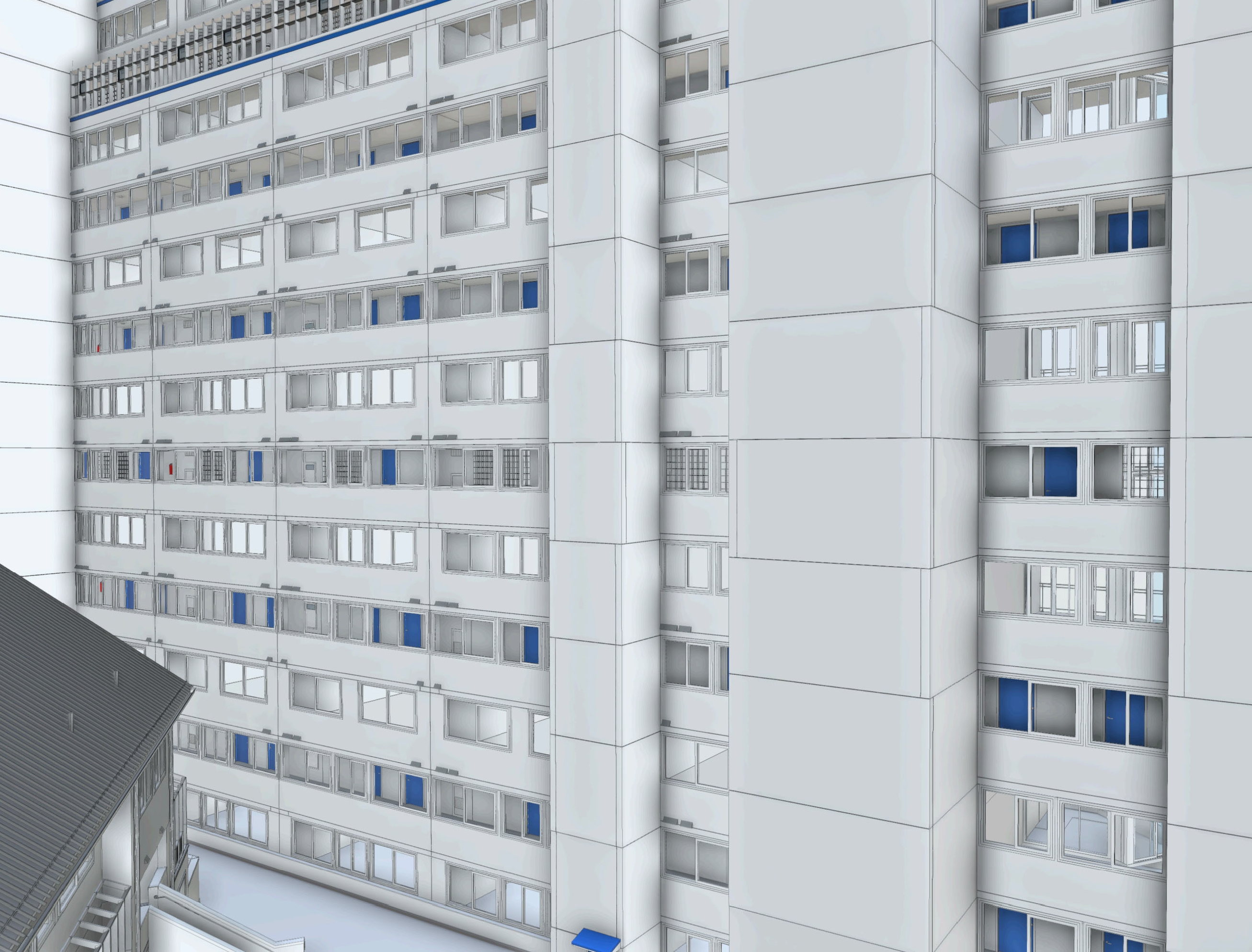 The main objective of this project is to model the façade of a multi-storey building accurately. The façade model was required because all construction drawings, vendor documentation, and renovation partners relied on this information for their work. The model served as the primary visual and technical reference for the renovation process, ensuring coordination between architects, contractors, and other stakeholders.